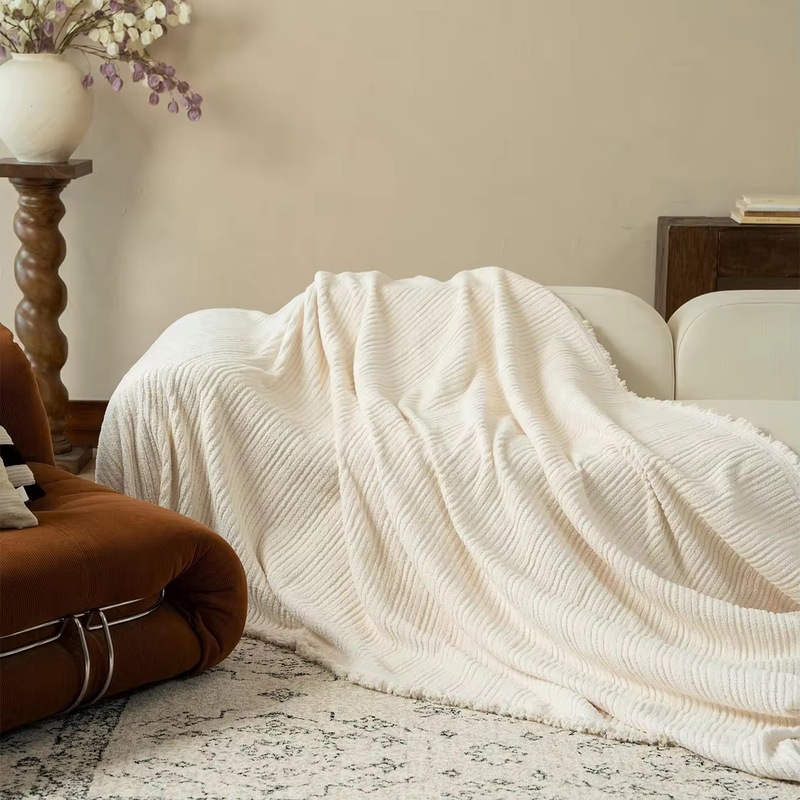 Modern Style Solid Color Textured Stripe Sherpa Woven Soft Throw Blanket With Fringe Sofa Living Room Bedroom Home Decor Blanket