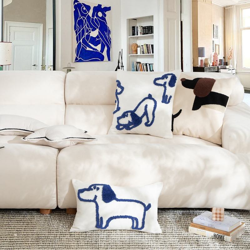 Blue Cute Dog Tufted Cushion Cover Polyester Pillowcase With White Zipper for Living Room Bedroom