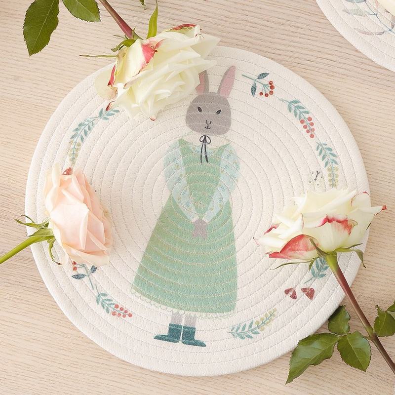 Hot Selling Cartoon Rabbit Water Hyacinth Placemats Round Woven Animal Printed Decoration Table Mats for Easter Day