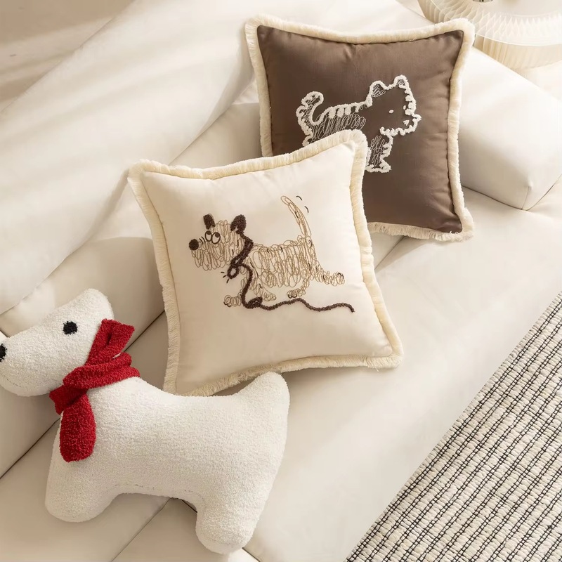 Cute Dog Embroidered Cotton Cushion Cover Home Decor Soft Pillowcase Fringe Washable Foldable Pillow Cover for Sofa Living Room